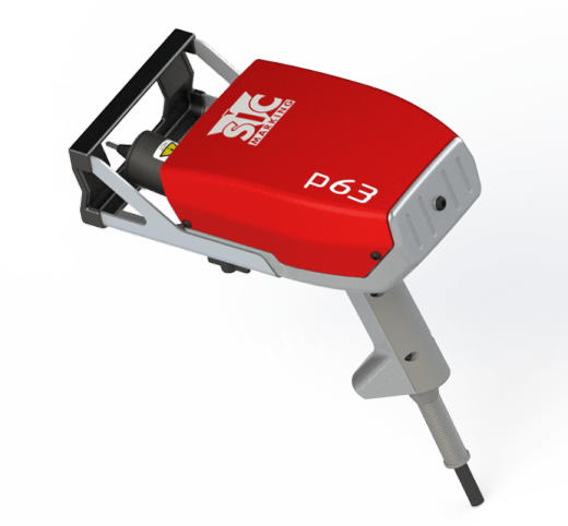 The p63 is a portable, handheld dot peen marker designed for use with the e10 controller. Its lightweight portability makes it ideal for marking large, difficult-to-access parts, and its arched front plate allows for sturdy marking on both flat and cylindrical surfaces. Capable of marking plastics and metals (up to 62HRC), the rugged cast aluminum body, ABS cover, and stainless steel front plate make the p63 a mobile, lightweight, and reliable tool. The marking pin is solenoid actuated and requires minimal maintenance and no air supply system.